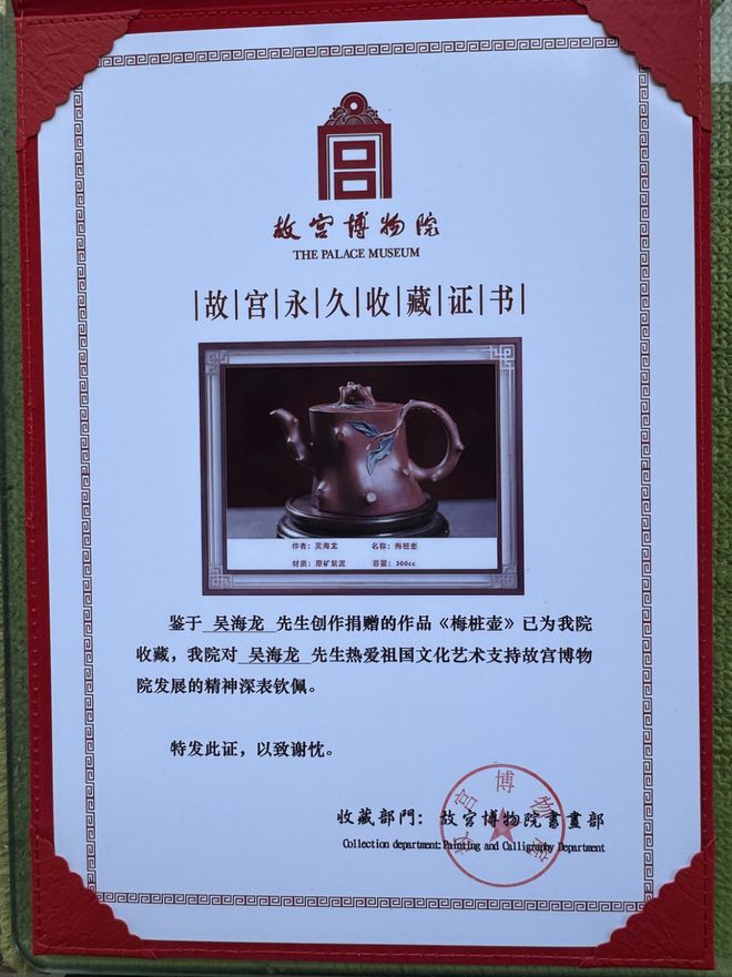 2025年“绞泥石瓢壶”“梅桩壶”被故宫博物院永久收藏。