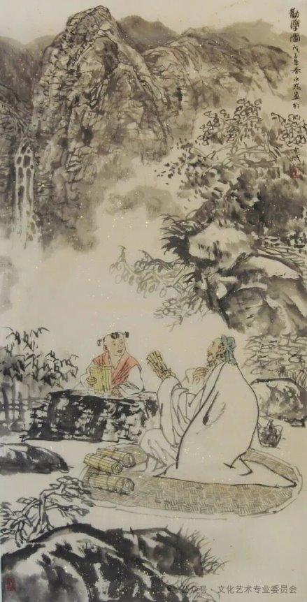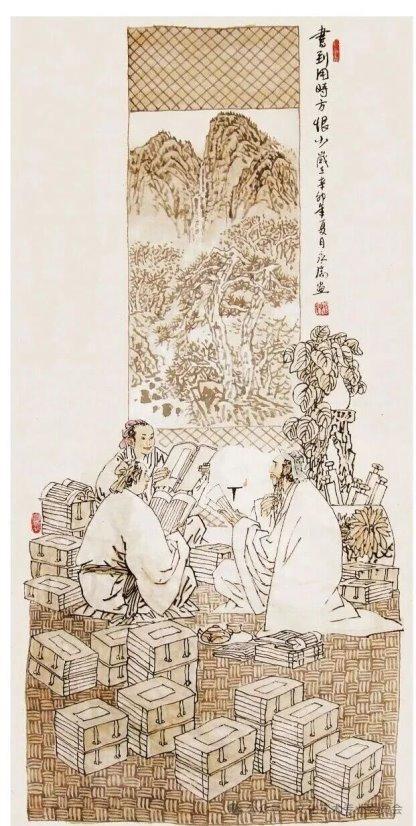 穆永瑞的古代人物系列作品多取材于大众喜闻乐见的古代历史故事、神话传说及文学典故,题材广泛,风格多样。欣赏《书到用时方恨少》,观者首先会被古色古香的画面情调所感染。诲人不倦的先生,虔敬听讲的弟子,一摞摞的线状古籍,幽雅的室内环境,烘托出浓郁的读书氛围及作品的主题意旨。