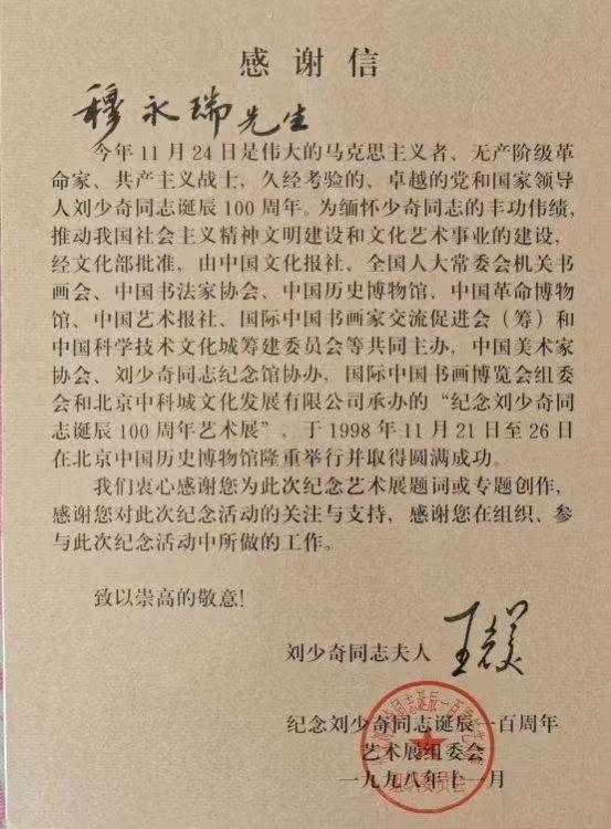 1998年11月21日至26日,作品参与“纪念刘少奇同志诞辰100周年艺术展”,获刘少奇夫人王光美同志亲笔签名的感谢信。