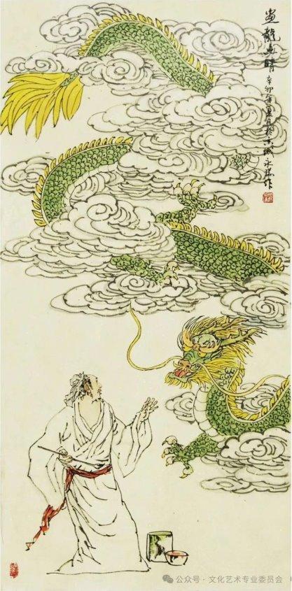 《画龙点睛》:137×67cm,取材自经典典故,寓意深刻,笔墨精炼,是其擅长的寓言题材代表作。
