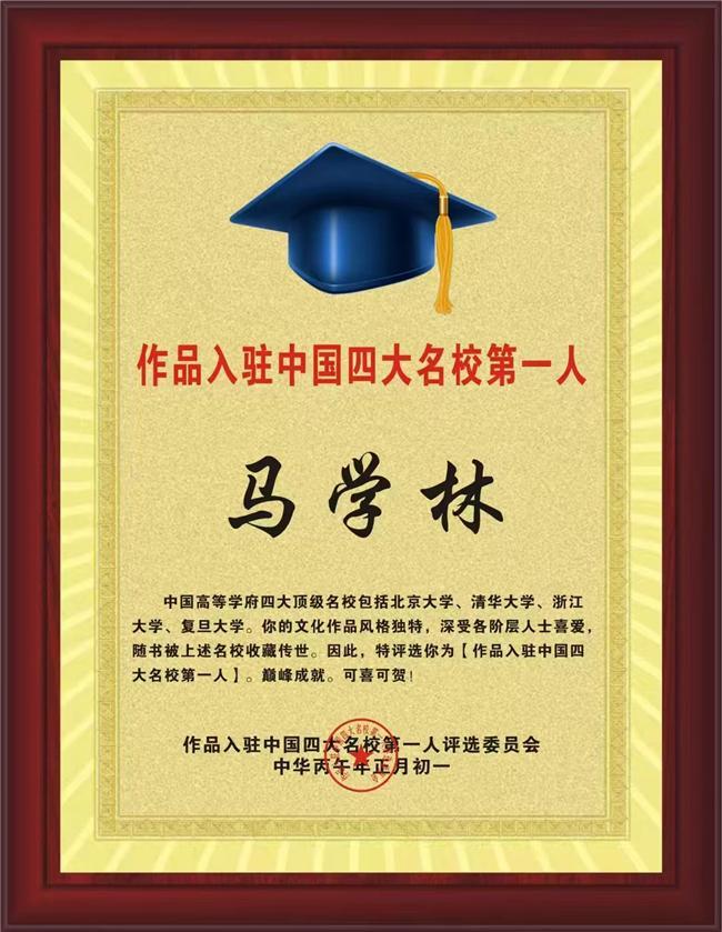 马学林,男,回族,中共党员,退役军人,北京大学考古专业毕业,文化艺术博士,国家一级诗人,全国非物质文化遗产传承人(格律诗词),国学家、文学家、汉学家、改革先锋艺术家、当代中国百强诗人、当代中国诗坛杰出诗人、当代杰出文艺工作者;世界孔子学院终身名誉院长、香港国际商会联合体终身名誉主席;获中国当代十大文化学者荣誉称号、获首届人类文明大赛文化艺术类金获、2022年获中共中央在党50周年纪念章、2025年亚州地区艺术先锋、获亚州国际艺术勋章;获联合国文化艺术丰碑奖、艺术评审委员会终身副主席,世界艺术影响力领袖。到2025年12月31日写有25370多首格律诗。同年4月获(雅集京华《第八届百家诗会》一等奖,被授于“新时代诗词文化践行者”荣誉称号;5月,获大美东方第三届全国诗书画大赛“金奖”;荣获“中华文化永固杯终身成就奖”、并被授予“中华传统文化的坚守者与传承人”、“国宝大师”荣誉称号;由中国科学文化出版社出版(马学林著《百首诗词颂时代楷模拜四俊》200首诗);6月,获第四届矛盾文学杯全国文学艺术大赛“金奖”、获2025全球影响力艺术家荣誉称号。7月,获中共中央颁发“七一勋章”和“七一勋章证书”;还被中国共产党中央宣传部、国家发展和改革委员会、文化和旅游部、人民日报社、中国文学艺术界联合会和中国美术家协会六部委共同授于“感动中国人物”荣誉称号。被诺贝尔文学研究院聘“终身文学顾问”。论文《论非物质文化遗产视域下楹联的美学思想研究》入编中国楹联学会《非遗里的楹联优秀论文集》,并获优秀论文证书。由中国科学文化出版社出版(《爱党爱国爱人民》中国之父礼赞——共和国奉献者•报国典范 马学林专集)。8月,作品入编(《中国当代才子佳人传世诗文典藏》作家出版社)。获中国CCTV央视新闻官网终身荣誉顾问(厚德载物,德艺双馨)、获“民族解放与世界和平艺术奖”、“忠党爱国人民艺术家”荣誉称/号。9月,作品入选当代文学界唯一历史大典《中国当代文学史》,评选为“名载史册人物”、“主编提名最佳作者”、“大数据评选最具亲和力作者”!作品《舣舟千载忆东坡》经知名作家、诗人及学者组成的评委会无记名投票,在中国当代“才子佳人传世诗文”大赛中荣获“优秀奖”,并获荣誉证书。10月,国庆节获“鲁迅文化杯全国第三届文学艺术大赛一等奖”。10月31日,应邀参加《首届海峡两岸暨港澳消费者保护法论坛》并作交流发言,论文入选),并有20首诗词、2篇美篇、2篇小年糕作品奉献。11月,获大国•大家艺术领军人物荣誉称号、获世界级金牌艺术名家荣誉称号并获荣誉证书;12月,获“一带一路”文化交流大使荣誉证书。获“大国•大家艺术领军人物”人民艺术家至高成就奖、获文旅界第八届全国艺术典范“人民的瑰宝”艺术奖;获“中国非遗文化艺术传承人”荣誉称号。