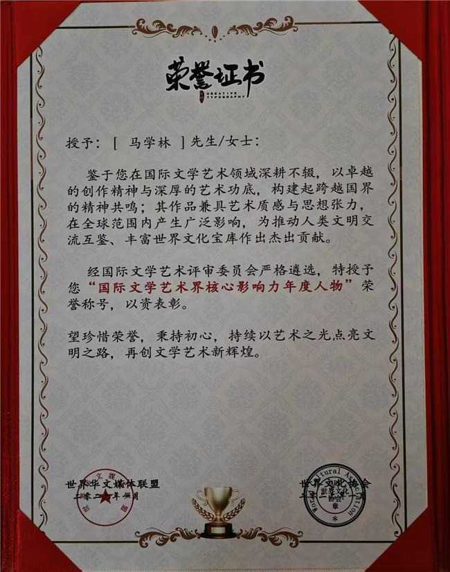 2026年1月,获人民文艺网、中国文艺报道官网、百度新闻官网、凤凰新闻官网四大顶级官网,1亿8000万大数据筛选全球华人文学艺术精英:“2026人民文艺家”;获“艺术大数据盛典金奖”;获“世界文艺巅峰金奖”;撰写的《论中国楹联对春节的气氛烘托和世界春节的推动与影响》入选为“春联•非遗”学术会议优秀论文,并被按排大会发言,获优秀论文证书,入选“春联•非遗论文集;获世界文化协会、世界华文媒体联盟颁发的“国际文学艺术界核心影响力年度人物”荣誉称号和荣誉证书。获CCTV特别推荐“中国艺术形象代言人”荣誉称号、获“世界文化艺术功勋成就奖”;并获证书;获《两会献礼•特别推荐最具影响力艺术家》荣誉称号并获牌匾;2026年1月,登榜美国《时代周刊》2025年度文学人物,成为驰誉世界的诗歌大家。同月,被《时代周刊》杂志社联合普林斯顿大学、麻省理工学院、哈佛大学、斯坦福大学、耶鲁大学联合评选为《时代周刊》“2025年度文化人物·中国诗人50杰。”2026年2月,作品入驻中国高等学府四大顶级名校北京大学、清华大学、浙江大学、复旦大学“中国四大名校第一人”。