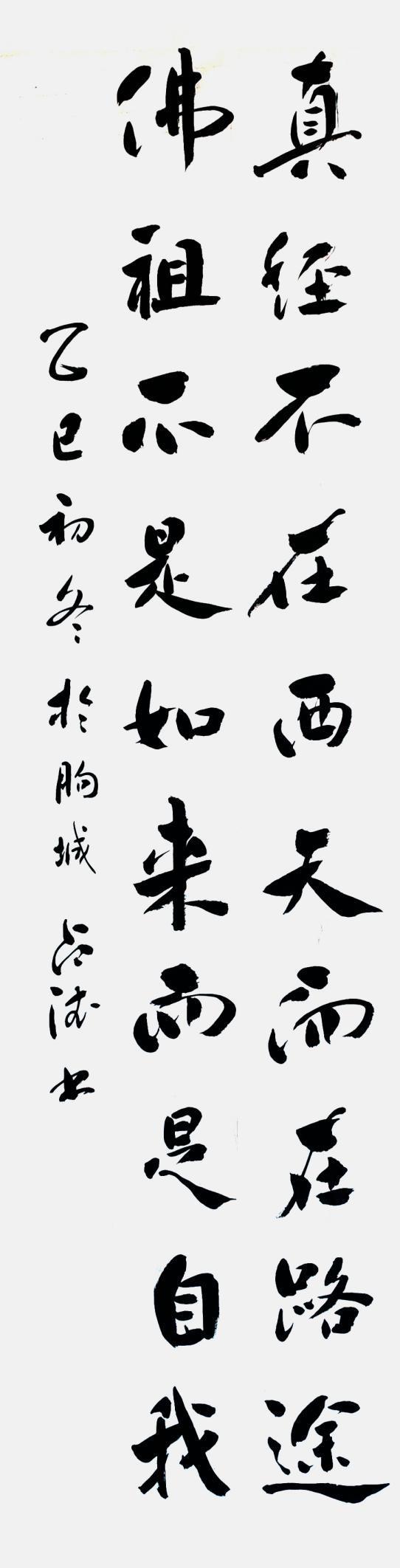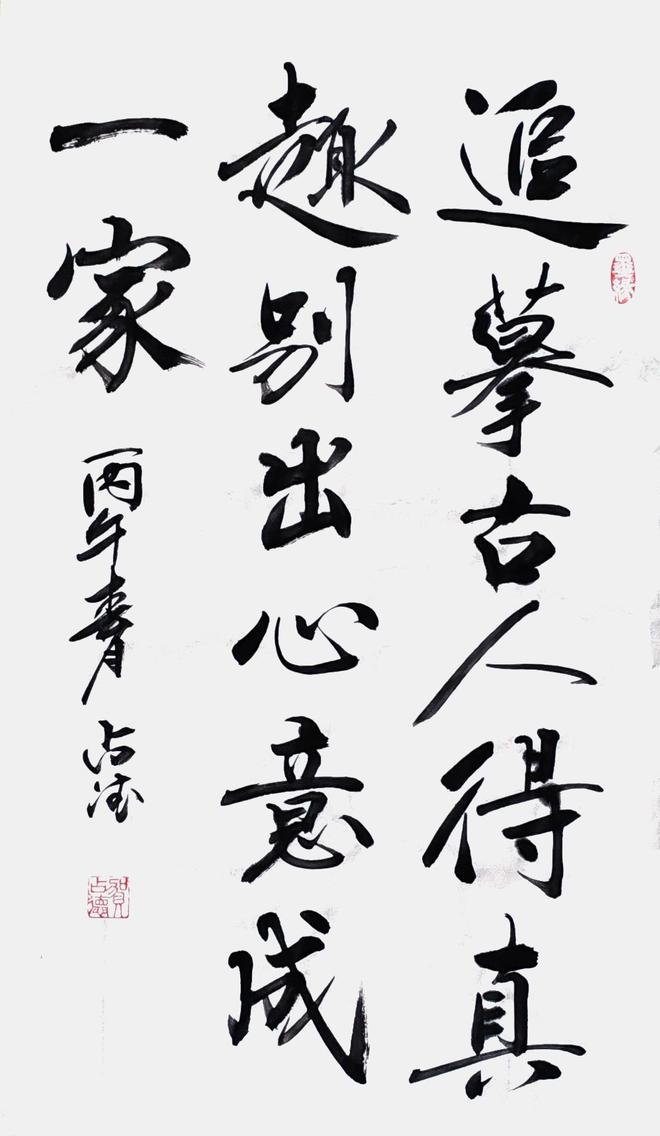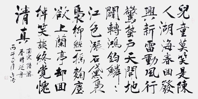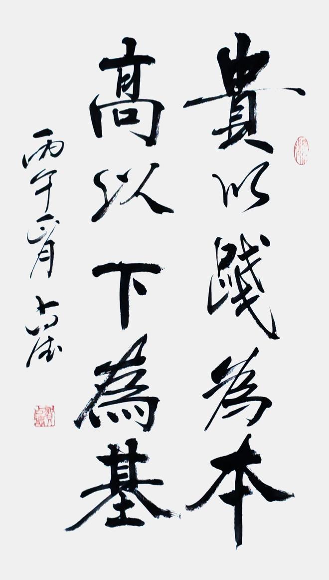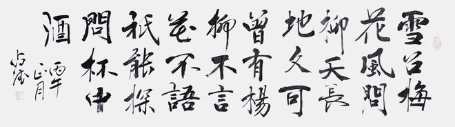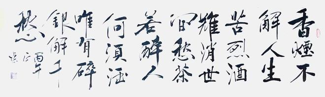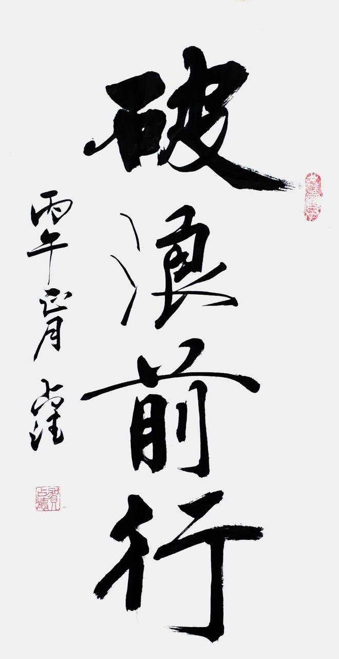 贺老师曾经是一位军人,军旅生涯也铸就了他在书法悟道表现的与众不同,他的行草书亦带有他强烈的个性色彩,没有完全追求奔放如流、跳荡纵跃和跌宕起伏的奇险之风,遒劲柔美中展现了不一样的精工,他的每一个字都很考究,给人与视角上的美感。那种舒缓讲究的笔势及老辣的精熟,让人恍惚之间穿越时空,亲临古人书法碑文的精妙。