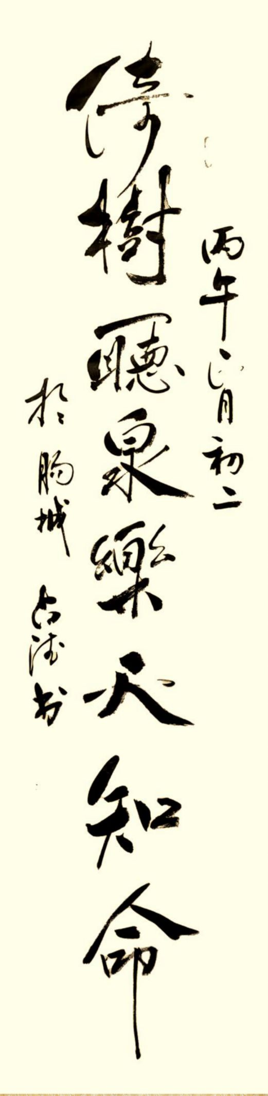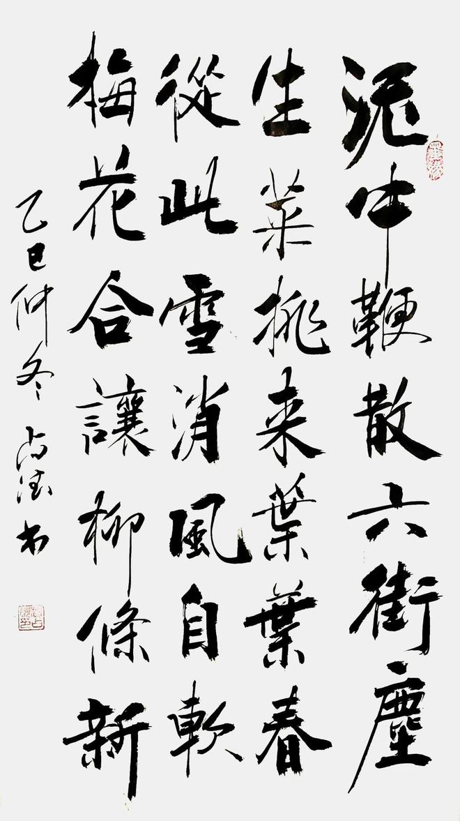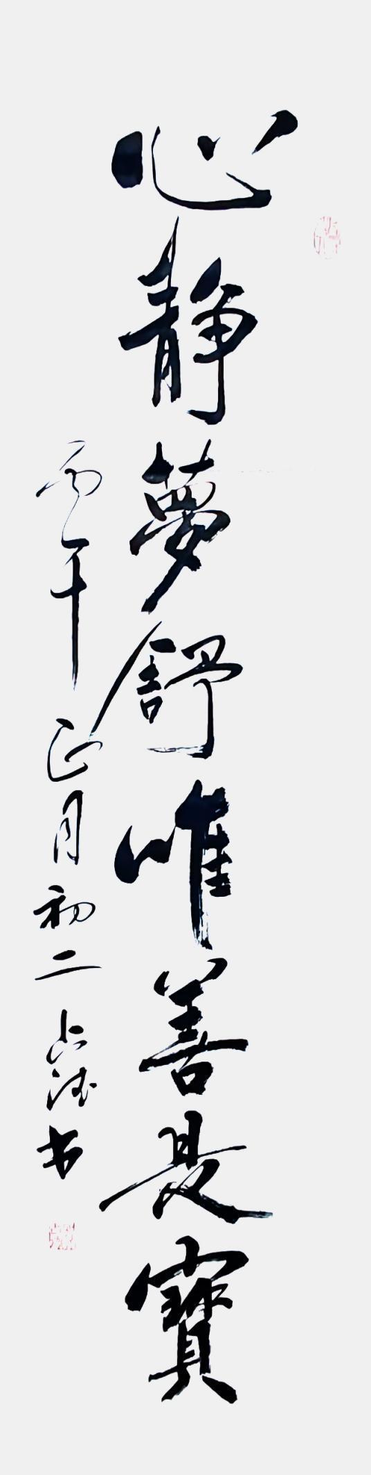 贺老师曾经是一位军人,军旅生涯也铸就了他在书法悟道表现的与众不同,他的行草书亦带有他强烈的个性色彩,没有完全追求奔放如流、跳荡纵跃和跌宕起伏的奇险之风,遒劲柔美中展现了不一样的精工,他的每一个字都很考究,给人与视角上的美感。那种舒缓讲究的笔势及老辣的精熟,让人恍惚之间穿越时空,亲临古人书法碑文的精妙。