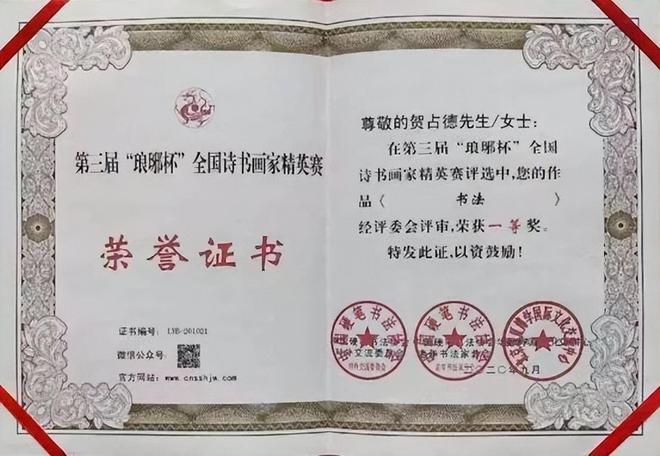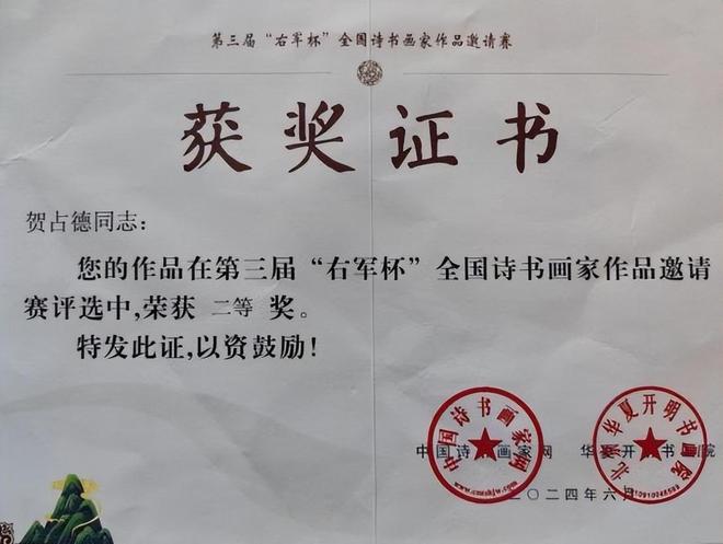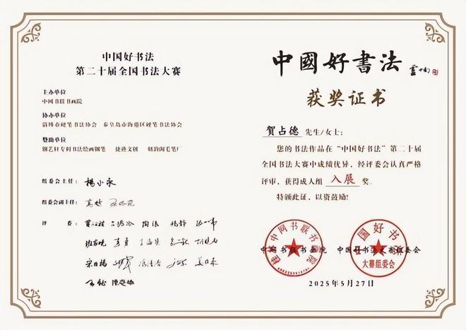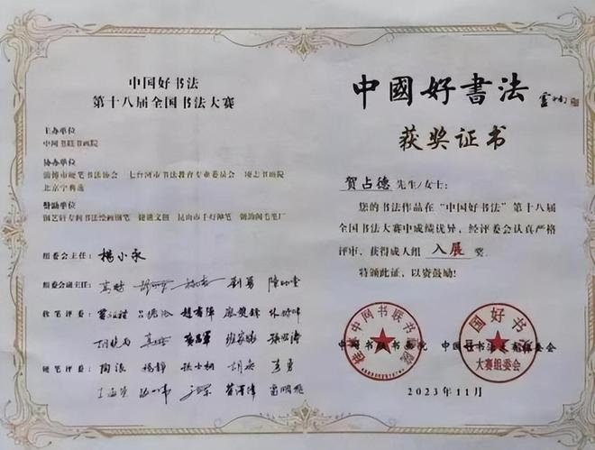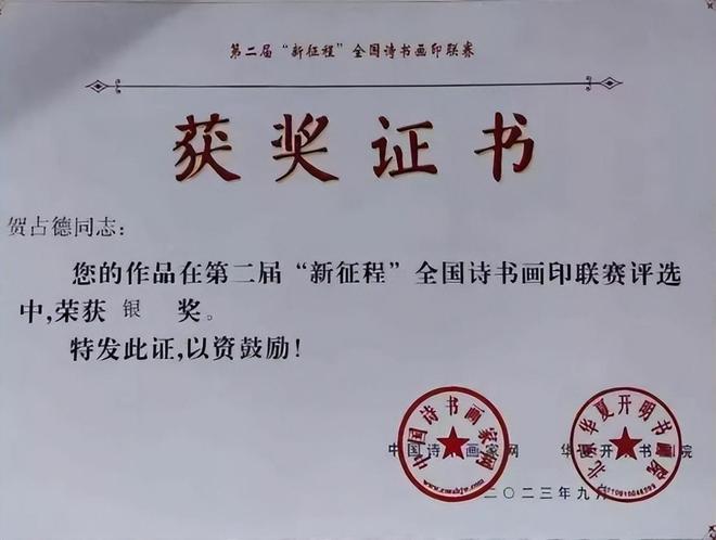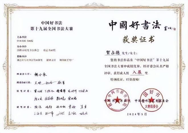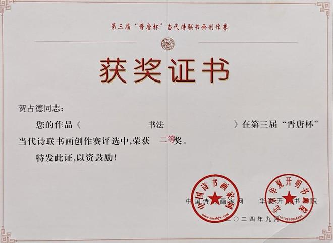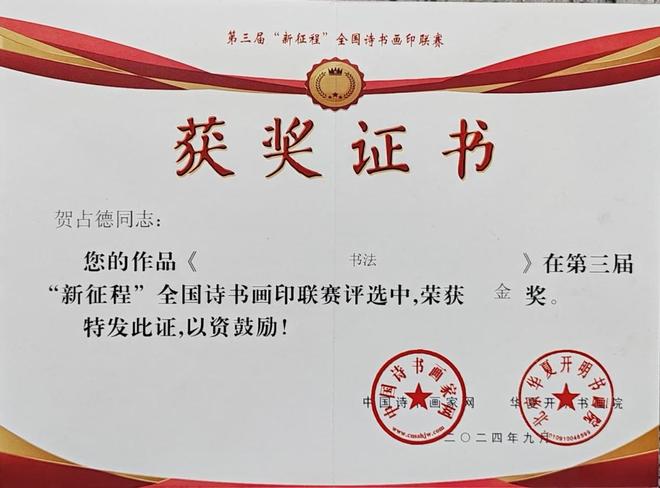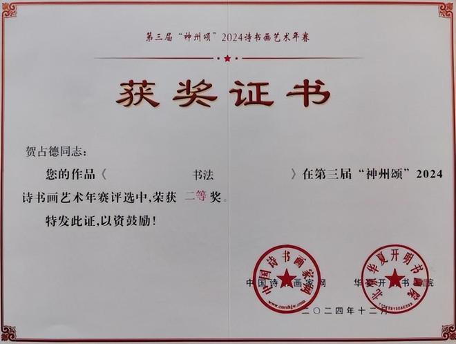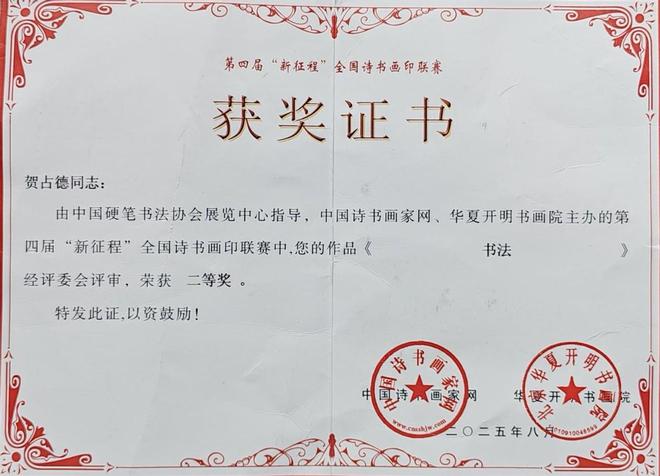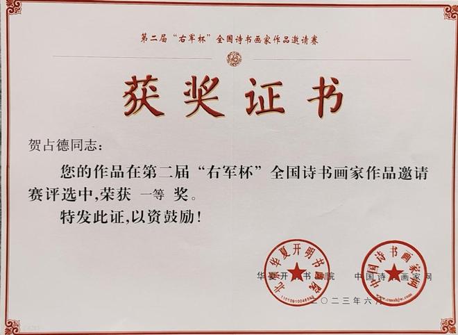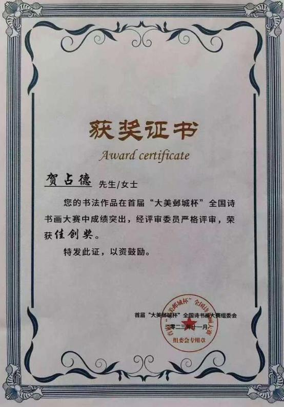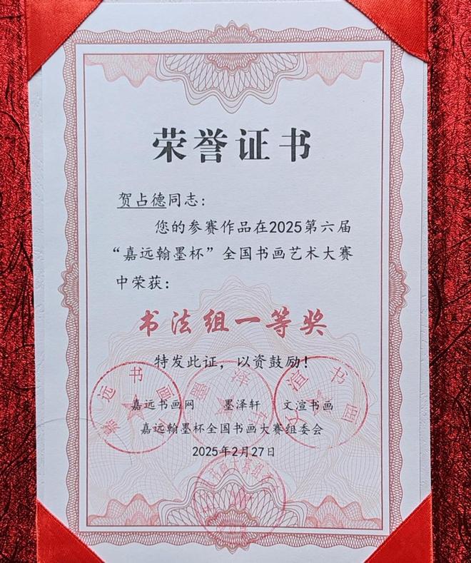 贺占德,男,1962 年 1 月出生,山东省临朐县人,现为中国书法家协会会员,中国硬筆书法协会会员,中国翰墨文化研究委员会副主任。系全国金鼎文化艺术名家榜入榜艺术家、中国翰墨书画院副院长,CCTV·中视文化 CCTV·华夏之声专题形象报道艺术家。中國楹聯學會會員。1979 年 10入伍,1997 年 9 月转业,从小酷爱书法,临摹褚遂良的《雁塔聖教序》、《陰符經》和《倪寬贊》,欧阳询的《九成宫醴泉铭》,王羲之的《兰亭序》、《怀仁集王羲之圣教序》等字帖。数十年来,临池挥墨,不敢懈怠。