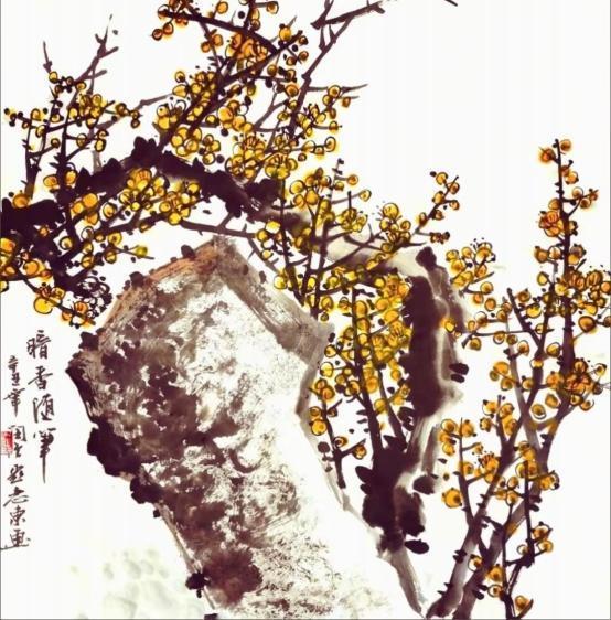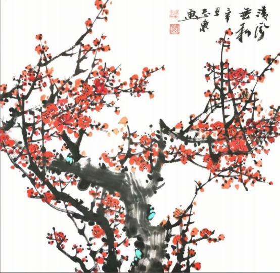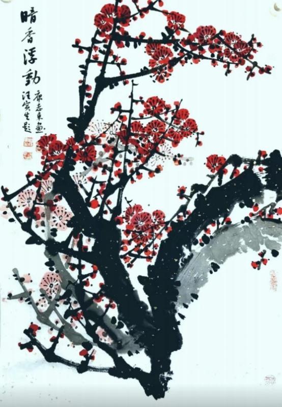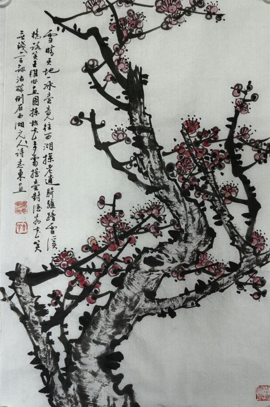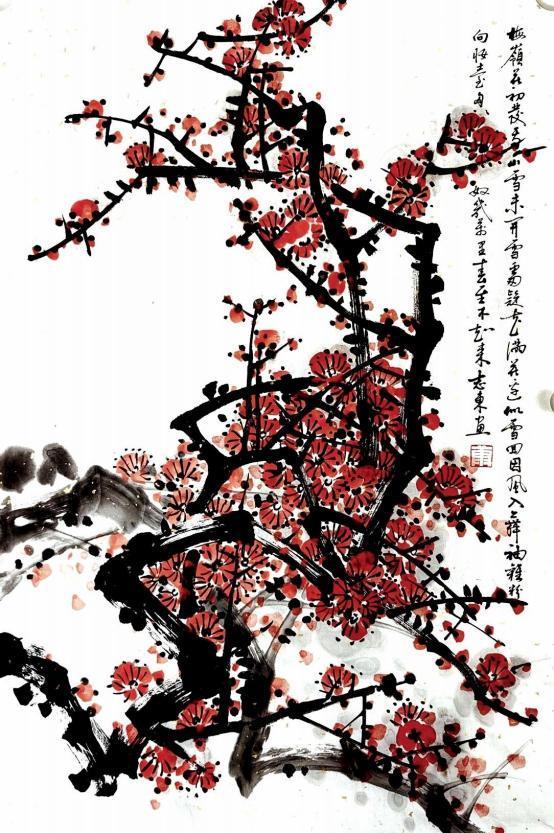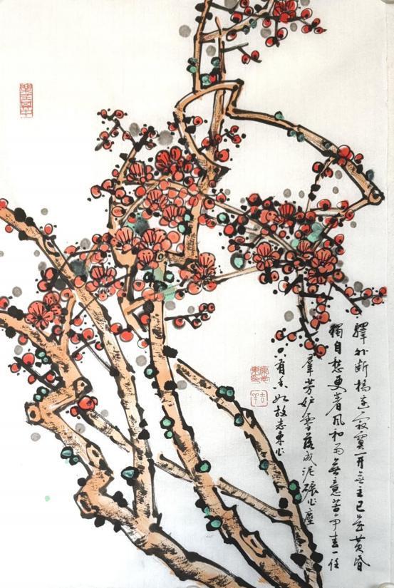 在色彩的运用上,康志东同样有着非凡的创造力。他巧妙地运用对比色和互补色,让画面鲜活明亮起来。在他的作品中,你或许会看到洁白的花瓣与浓墨的枝干相互映衬,或是嫣红的花朵与淡雅的背景形成对比,色彩的强烈碰撞却又和谐统一,让梅花仿佛从画中跃然而出 ,给人以强烈的视觉冲击。同时,他还擅长运用水墨渲染,营造出淡雅清新的氛围,让观者仿佛能嗅到那一缕若有若无的梅香,沉浸在梅花的高洁意境之中。