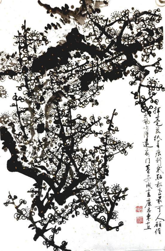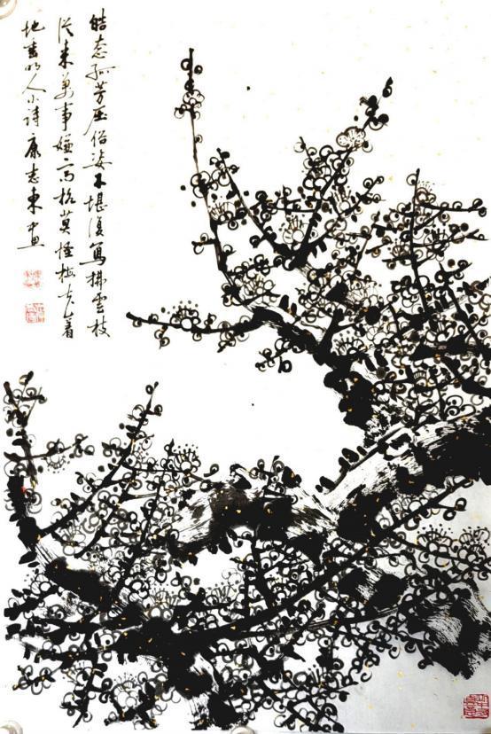 除了在笔墨和精神内涵上的独特表达,康志东还在构图上精心布局。他的画作常常打破常规,以新颖的视角和独特的构图方式,展现出梅花的别样之美。有的作品采用全景式构图,将大片的梅林展现在观者眼前,营造出壮观的气势;有的则采用特写式构图,聚焦于一枝梅花,细腻地描绘其花朵、枝干,让观者能够近距离感受到梅花的精致与韵味。这种多样化的构图方式,不仅丰富了画面的形式感,也为观者带来了不同的视觉体验。