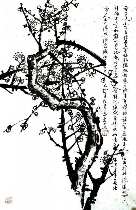 康志东的梅花画作,首先引人注目的便是其独特的笔墨运用。他将书法功底融入绘画之中,以书入画,赋予了梅花别样的韵味。其笔下的线条,恰似灵动的舞者,粗细浓淡间尽显变化。画梅枝时,那顿挫有力的线条,仿佛是岁月镌刻的痕迹,展现出梅花枝干的苍劲古朴;画花瓣时,细腻流畅的笔触,又似春风拂过,轻柔地勾勒出梅花的婀娜姿态 ,刚柔并济,方圆结合,虚实相生,尽显动态美感与独特的韵律。