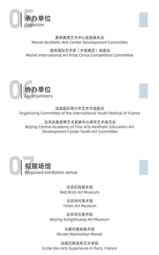 设立莫奈国际艺术奖、为了纪念法国印象派艺术大师克劳德·莫奈而设,主办机构:莫奈国际艺术奖组委会,莫奈美育中心,法国国际青少年艺术组委会联合主办。在艺术界享有很高知名度,吸引和邀请全球众多国家艺术家作品参与,具备广泛国际影响力。