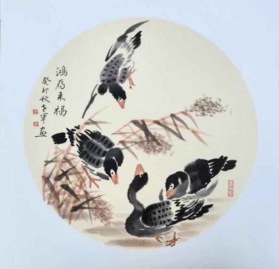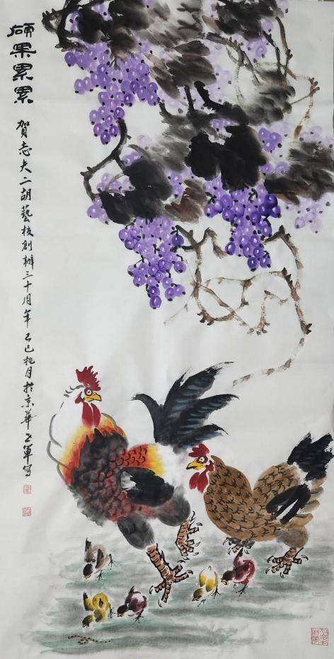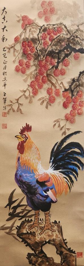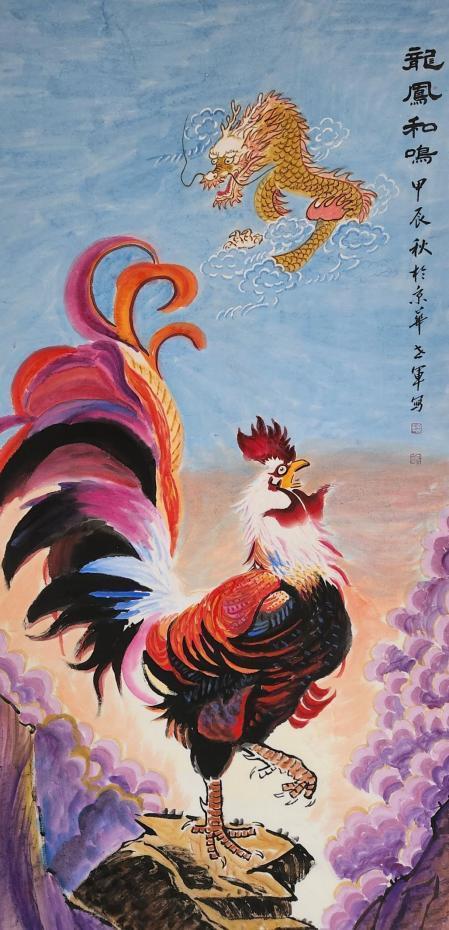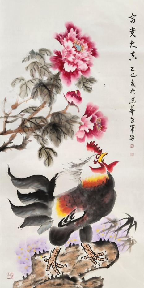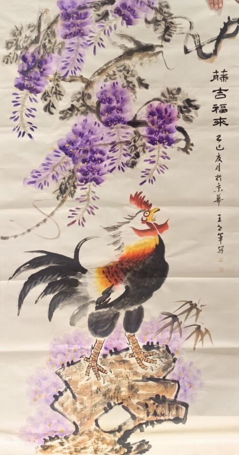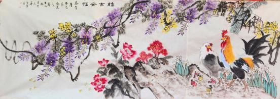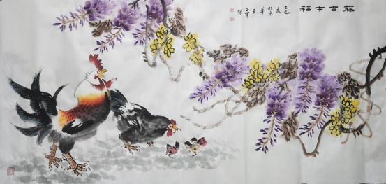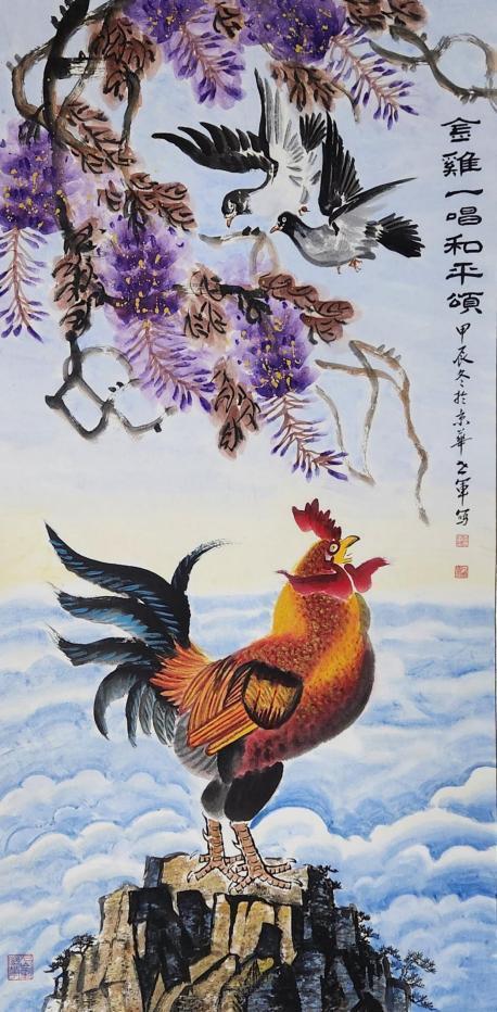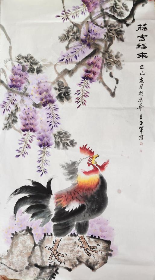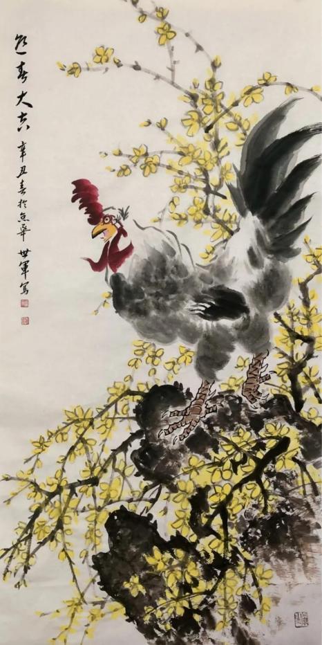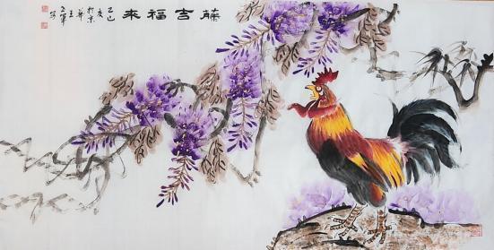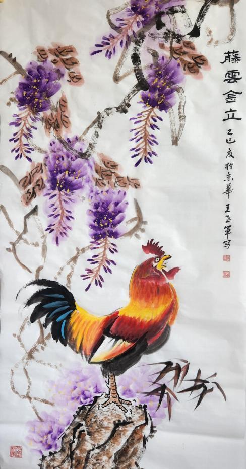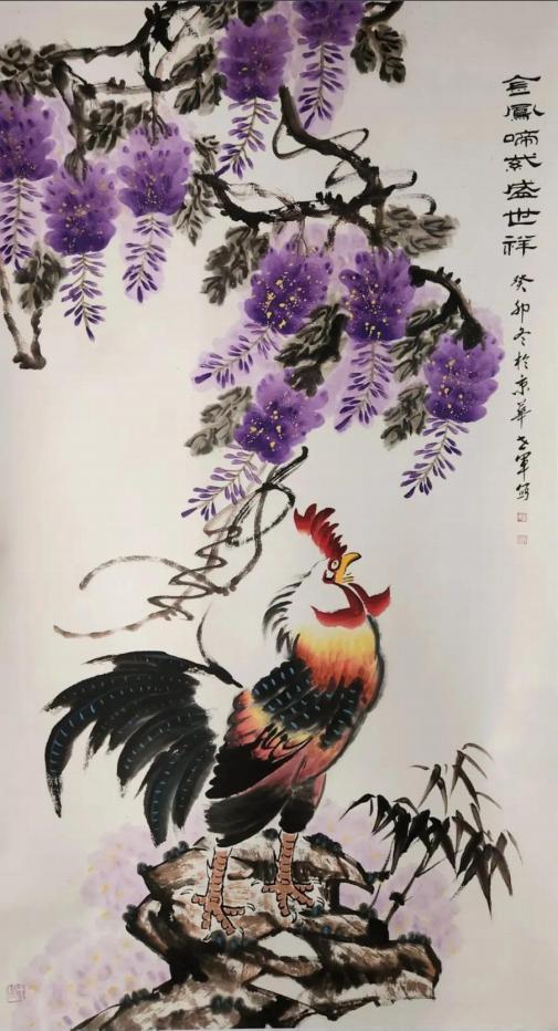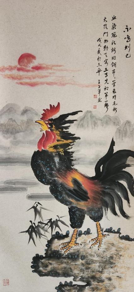 王世军先生的画功底深厚,笔墨灵动,构图美妙。在他看来,作画不但要笔墨精彩,还要意味深长,主题饱满。画家同时把鸡的五德一览无余跃于纸上,所谓五德即:文:气质清清,武:雄风凛凛,勇:勇于担当,仁:仁厚博大,信:诚信天下。有这样的德性,才算是一幅有灵魂的书画作品。他的作品笔法考究,收放自如,张驰有度,在浓淡、干湿之中求变化,在粗细、大小之间论对比。哪怕一个细小的缀墨微点都精到、超脫,妙趣天成。